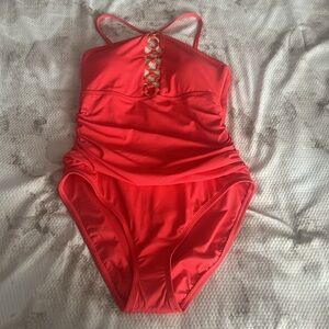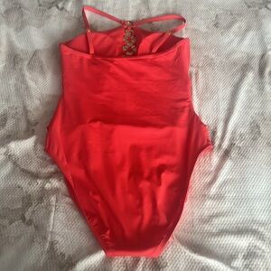 Stylish coral swimsuit with a chic design. Perfect for a day at the beach or pool.