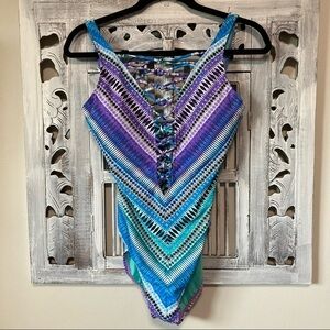 Bleu Rod Beattie Knotty Lace Down High Neck Blue/Purple One Piece Swimsuit NWOT