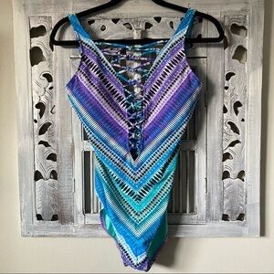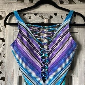 Bleu Rod Beattie Knotty Lace Down Blue and Purple One Piece Swimsuit