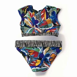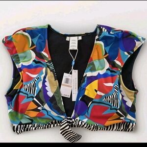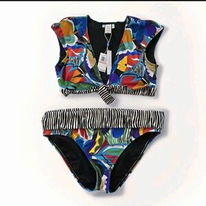 Bold abstract bikini with vibrant colors. Features a tie-front top and striped accents. Ideal for beach outings.