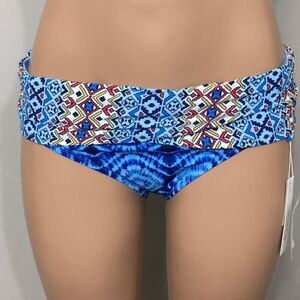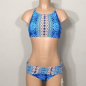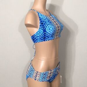Beautiful blue tie dye and tile print bikini. Top is a sporty high neck with straps that make for easy adjustment. It has soft removable pads. Bottoms have a fold over cross front flap. Ruching on the sides. I love the vibrant colors in this.