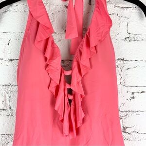 EUC watermelon pink deep v ruffle halter one piece swimsuit by Bleu Rod Beattie in a size 10. In excellent used condition. Please see all photos for details.