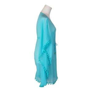 Bleu Rod Beattie Turquoise Pom Pom Trim Sheer Beach Cover Up Size S