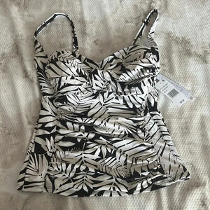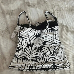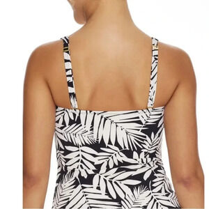 A tropical paradise is never too far away whenever you wear this palm leaf print tankini top. Made of nylon, polyester, and spandex.