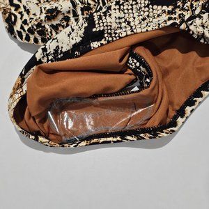 Reptilian and jungle cat patterns cover this high waisted swim bottom. Made of nylon, polyester, and spandex.