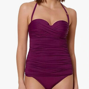 Molded bandeau tankini top with figure flattering shirring and adjustable, removable straps.