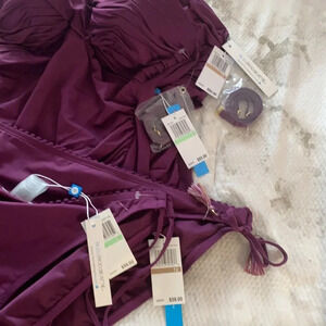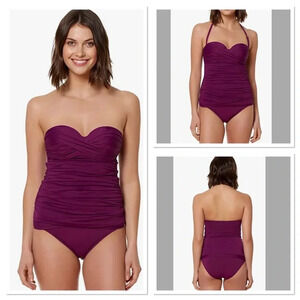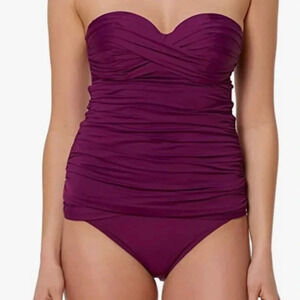 Molded bandeau tankini top with figure flattering shirring and adjustable, removable straps.