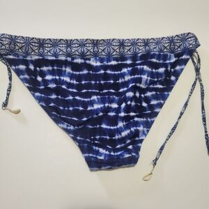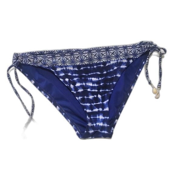 Style name is I’ve Got You Babe, side tie hipster bikini bottoms by Bleu Rod Beattie. Seashells at end of the string ties. Indigo, navy blue and white Ikat shibori tie dye pattern. I cut out the tag but it was a size 12 and is adjustable. In excellent condition with no damages, worn and hand-washed twice (air dried). Price includes only the bottom part of the set. Retail $59. I do not have the matching top to this bottom anymore.