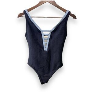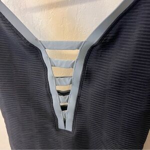 Bleu Rod Beattie lined one piece swimsuit, black with grey trim details, adjustable straps, soft cup