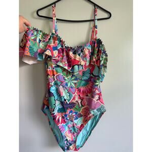 Bleu Rod Beattie, ruffles off shoulder, one piece swim multicolored