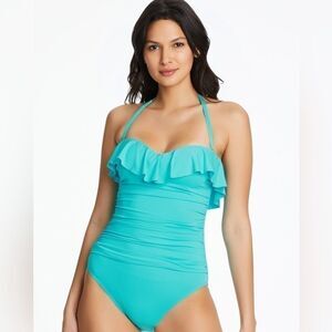 Bleu by Rod Beattie Shirred Ruffle Bandeau Mio One-Piece Swimsuit Wave size 14