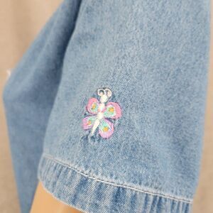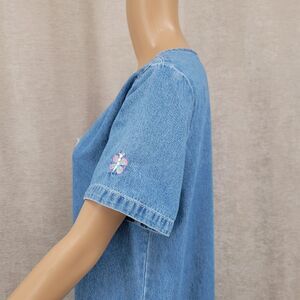 Charming denim dress featuring daisy patchwork embroidery. Perfect for casual outings.