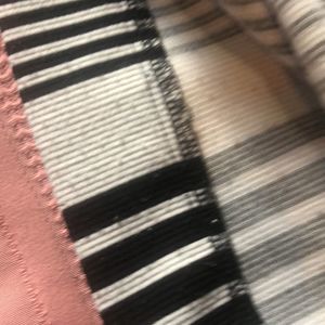 Sleeveless, striped top black and white with exposed back zipper will work hard for you in the office. Has small slits on side at the hem for ease. 100% rayon so cold machine wash, easy care. some piling at the hem but only inside so not noticeable. See photos.