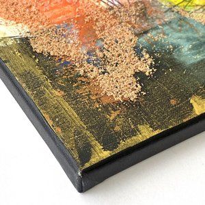 This unique piece is from the artist's Asian Fusion Graffiti series featuring her Chinese character practice papers as well as many other exciting collage papers and international postage stamps. Orange sand and shimmery dichroic glitter finish off the painting with an alluring texture.