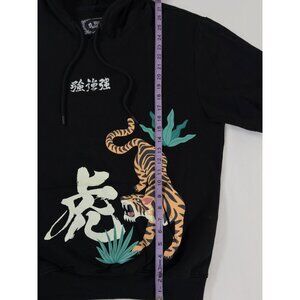 Bold and rare Blind Rooster men’s pullover hoodie street fashion in black with vivid tiger and kanji print front and back. Soft, cozy, cotton-poly fleece interior, kangaroo pocket, and drawstring hood. Excellent condition.