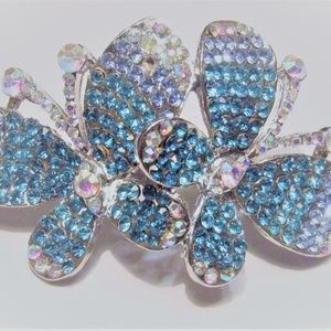 Huge size (3.00" inches across x 1.95" tall) for maximum blingy impact. There are blue rhinestones and clear rhinestones with an aurora borealis finish. The pictures just don't do it justice. This sparkle can blind you from across the room.