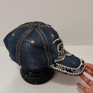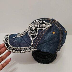 Bling Bedazzled Y2K Style Women's Baseball Cap, Blue Denim with Black Floral Fabric Butterfly, Edging in Rhinestones, Adjustable Hat One Size. 100% cotton. Machine washable in bag. Made in China.