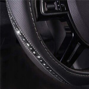 Bling Diamond Black Leather Steering Wheel Cover, Studded Crystal Rhinestones