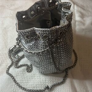 Stylish silver chainmail shoulder bag with a sleek chain strap. Perfect for a night out.