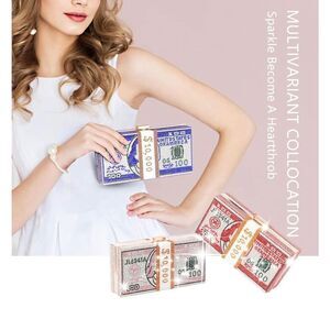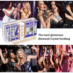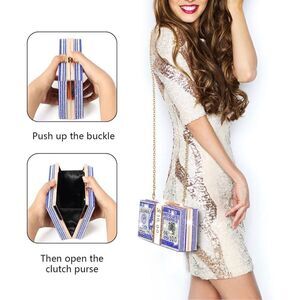 Ladies super cute multicolored dollar bill shaped bling box bag. Excellent condition. New with tags. Includes Chainlink detachable shoulder strap. Approximately 8" width 4" height 2.2" depth.
