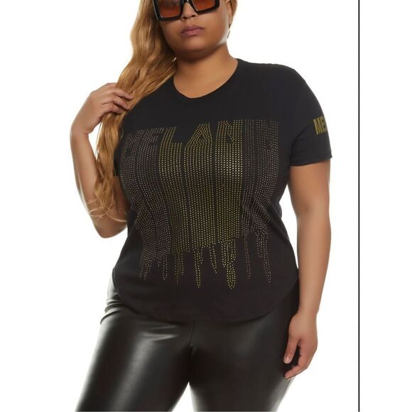 Ladies super cute black cotton multicolored rhinestone bling graphic Melanin T-shirt. Excellent condition. Ladies size 1X.