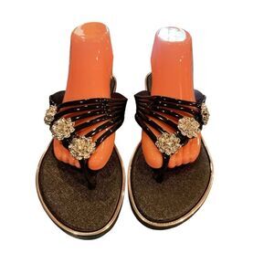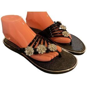 Super cute and sexy bling sandals. Black strap and rhinestone flower vegan leather sandals with silver accented black rubber bottoms. In between toes design. Dress that little black dress up or just a summers night outfit and either way you can’t go wrong. Size 10