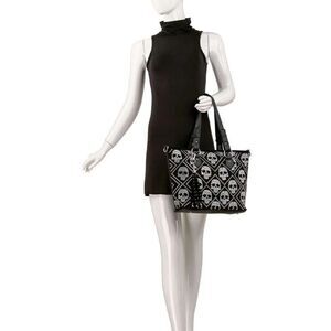 Get ready to turn heads with our Bling Skull Tote! Made of faux leather, this classic tote features an eye-catching design of sparkling skulls and a detachable tassel. The interior is lined and includes slip pockets and a zip pocket for organization. With a top zip closure and tablet compatibility, this tote is both stylish and functional. Approximate size is 15L x 10.5H x 4.5W