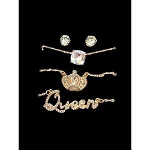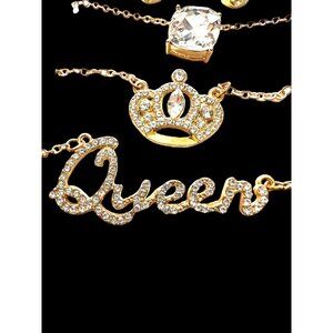 Blingy Set of Gold Chain Necklaces w QUEEN CROWN & Large Faux Diamond w Earrings