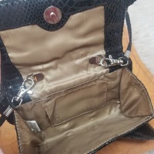 Blingy black wristlet. Approximate measurements are 8" x 5". Strap is approximately 43" and is not adjustable. Could be adjustable by tieing a knot in strap.