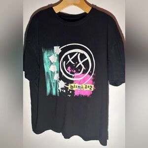 Black Blink-182 t-shirt with colorful graphic design. Features pink, teal, and white accents.
