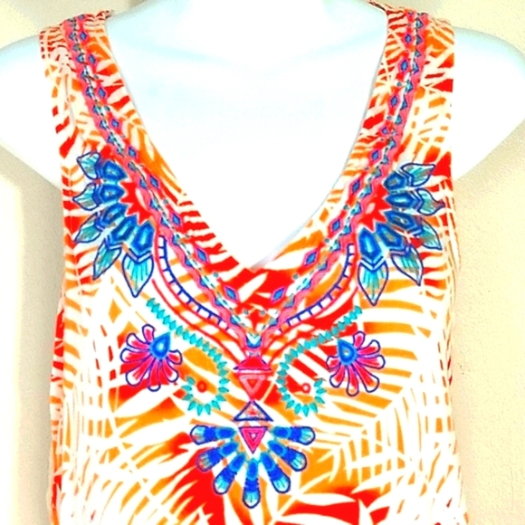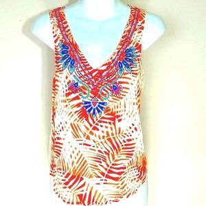 Bliss Couture Tank top Palm Leaf print embroidery white orange pink blue Bright