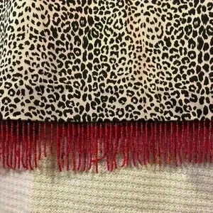 Bliss animal print, fully lined, beaded hem, pencil skirt. Red lining. Red iridescent beading at the hem line. Back zipper. Single back vent slit.