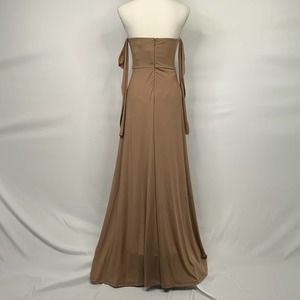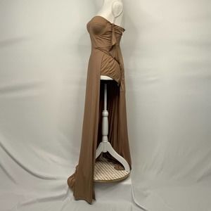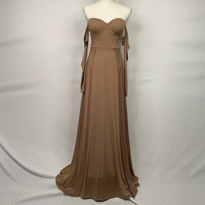 NWT GORGEOUS maxi dress in tan/nude color. This dress has a fitted bodice with attached off shoulder full length sleeves. The dress has a non-digging looser fit body suit underneath. There is a main panel in the front of the dress along with two side panels which allow for a beautiful flow when walking.