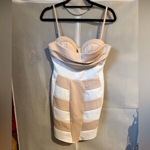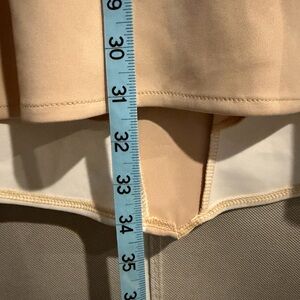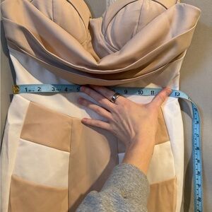 Beige and white, padded bra part. I tried to show how the folds stay more up when it’s being worn instead of flopping forward. From the top of straps to the hem on the front of dress is 34” and 31” in the back. Smoke free home.