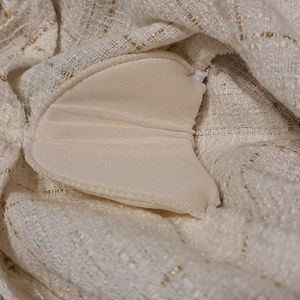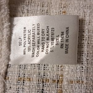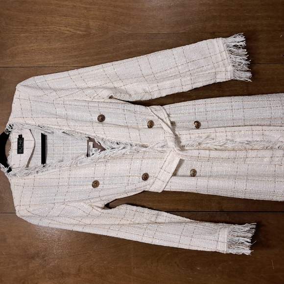 Blithe Los Angeles long open front, lightweight jacket with belt. This jacket is gorgeous! Double breasted gold buttons (but doesnt actually button), side pockets, fringed on sleeves, bottom, neck and front. Has small shoulder pads. Metallic gold threads throughout weave, no lining. Honestly love this jacket!!