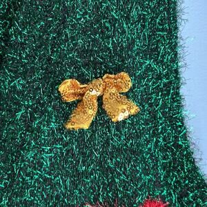 Tinsel like detailing, bows, bells, and balls embellishments. Please note one bell doesn’t ding. The other one does make noise.