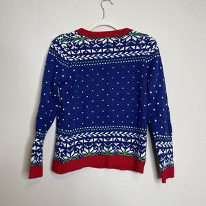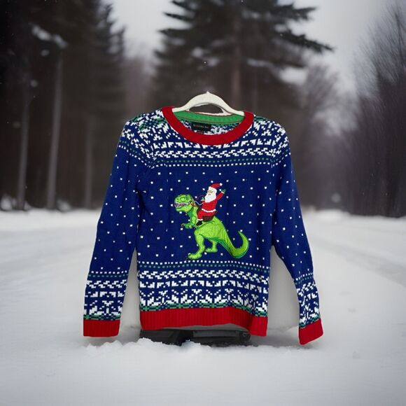 Blizzard Bay Ugly Christmas Sweater Women's Large 14-16 Blue Red Santa T-Rex