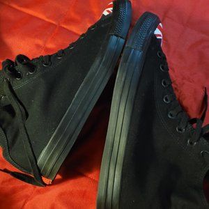 Black Union Jack toed Converse High Tops, size 10.5 Mens/12.5 Women's. I have only worn these a few times as has my wife. But we have to let someone else enjoy them. I am not much of a High Top fan but got these for the Union Jack. Would go great with a short plaid punk kilt/skirt or ripped jeans.