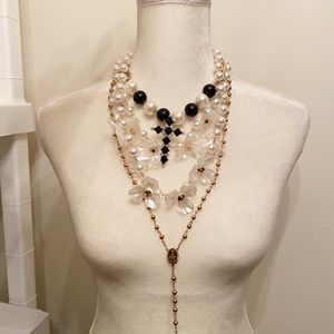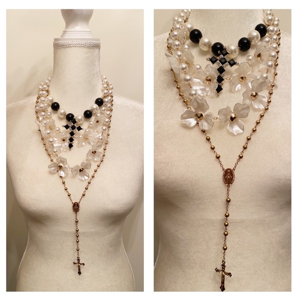 Fabulous Fashion Cross and Pearls Necklace. 3 necklaces for one glamorous look. First one is Fashion Gold Tone Color Chainlink with Black acrylic Cross. Black and white faux pearl accent. Second piece has faux cream colored Pearls with white flower accents. Cross rosary