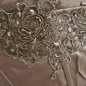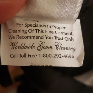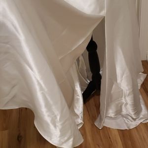 This dress is drop dead gorgeous! The fitted bodice has a sweetheart neckline with boning 9 rods. The sbottom has a slit and ruffle that makes showing off your shoes and legs tempting 😄 there is a train in the back with no hook. We had to undo some of the inside seam when working with the boning and cups for it to fit right. The zipper hook is not fully sewn down but is still attached and works. I wore this for a few events and formals and it has been kept dry cleaned.