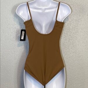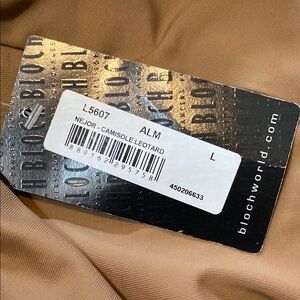 This Bloch bodysuit in a rich brown hue (almond) features delicate spaghetti straps and a classic scoop neckline. Made from a stretchy material, it offers a comfortable fit and a timeless design perfect for various occasions. Size large. Pit to pit 15”. Shoulder to crotch 24”.
