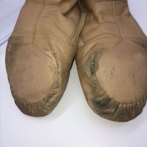 Good used condition Bloch tan leather modern/jazz dance shoes with 3/8" heels. Wear on heel and ball of foot pads. One area on the right sole has a rubbed spot from spins. A name in marker is written on insole. A great practice shoe for still rapidly growing feet.