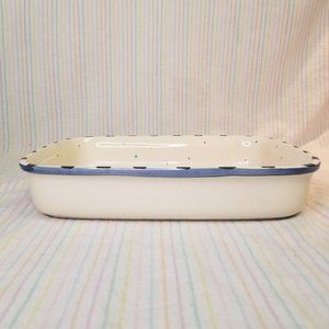This is a previously owned and used Block Basics Portugal baking dish with a hand painted design of vegetables, confetti, and a checkered rim. There is crazing on the exterior of one side only as shown. No other flaws or blemishes. It measures approximately 11.5" wide, 8.5" deep, and 2.5" tall.