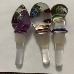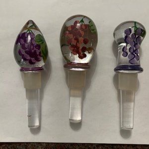 3 crystal hand painted grape themed stoppers with rubber rings. Measures approx. 4.75"H. Excellent condition-wear to box-see photos. White spots/lines are glare from lights. *Color may vary slightly from pictures.