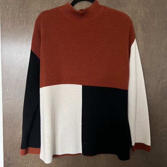Rust orange colorblock sweater with cream and black panels. Ribbed knit fabric with mock neck. Modern geometric design. #ColorblockSweater #RustSweater #MockNeck #FallKnitwear #GeometricStyle