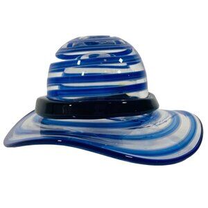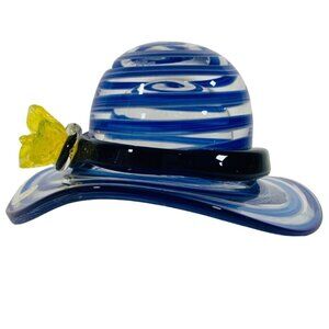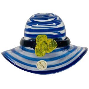 Add a unique touch of artistry to your collection with this Block Crystal glass hat figurine, beautifully mouth-blown and hand-polished. Featuring striking blue and white swirl glass accented with a bright yellow flower, this collectible showcases the craftsmanship and elegance that Block Crystal is known for.