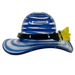 Block Crystal Art Glass Hat Figurine Blue Swirl Yellow Flower Vintage Collectibl
