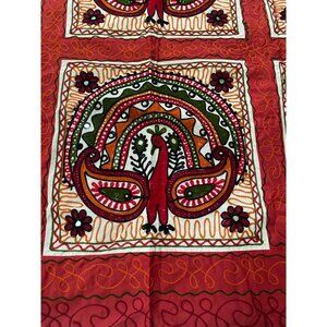 This Block Embroidered Indian Cotton Peacock Quilt is a light and cool bedspread perfect for summer. The multicolor quilt features a beautiful floral print with intricate peacock embroidery, adding a vintage touch to your bedroom decor. Made with cotton fill material and measuring 94" in length and 91.5" in width, this Queen-size bedspread is ideal for adults looking to add a touch of boho style to their space. Hand wash care. This also could be used for a table cloth or a wall hanging.