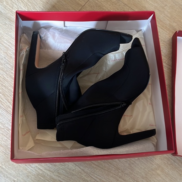 Black opened toed bootie. Material is extremely comfortable. Feels like neoprene. Worn twice. Accurate to size