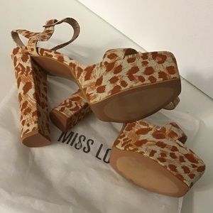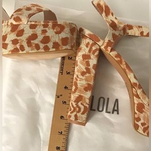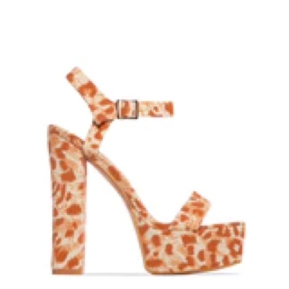 Step into the spotlight with these stunning Miss Lola 6-inch platform sandals! Featuring a bold orange and cream animal print, these heels are designed to make a statement.